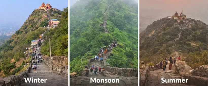 Although the hill looks beautiful during the monsoon, a lot of caution must be exercised as the steps are slippery, and summer visits must be made early in the day.